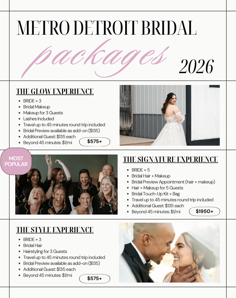 We proudly serve brides across Michigan and surrounding states! For on-site services a travel fee may apply based on the location. Contact us for a custom quote and let us bring our bridal beauty expertise to you!
